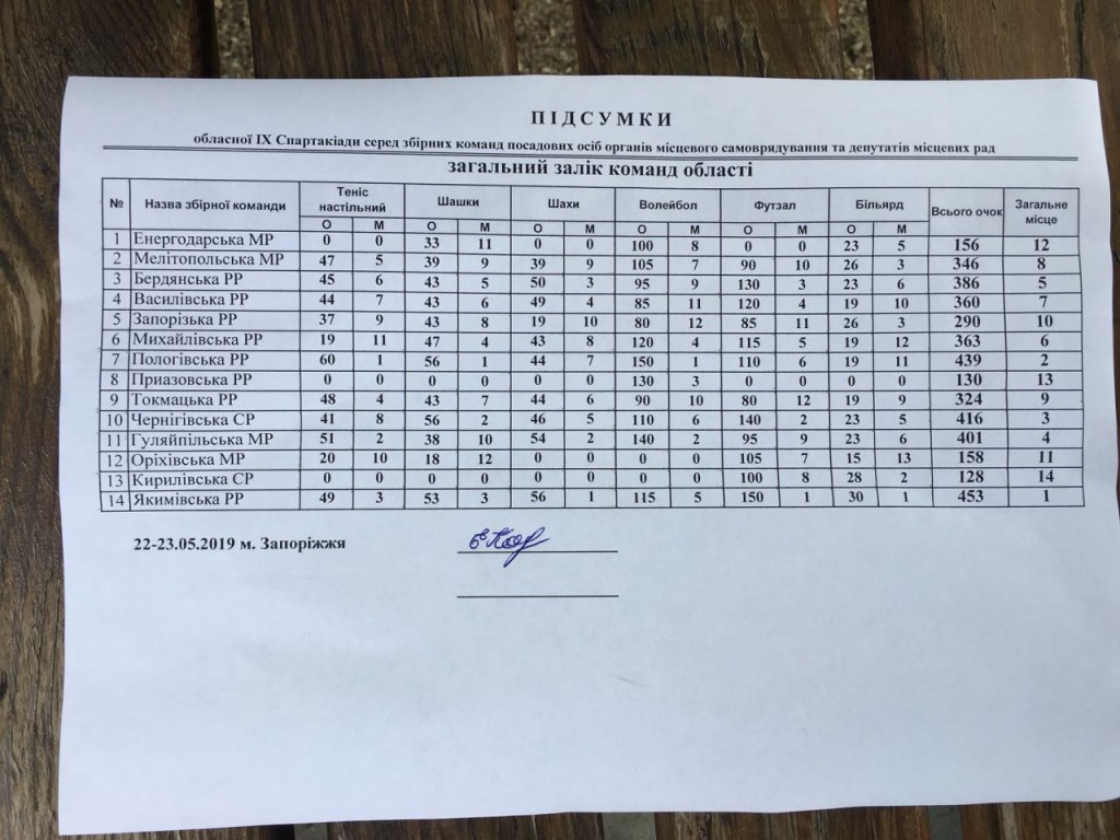 З 22 по 23 травня поточного року відбулася ІХ обласна Спартакіада серед збірних команд посадових осіб органів місцевого самоврядування та депутатів місцевих рад за участю 14 команд Запорізької області.